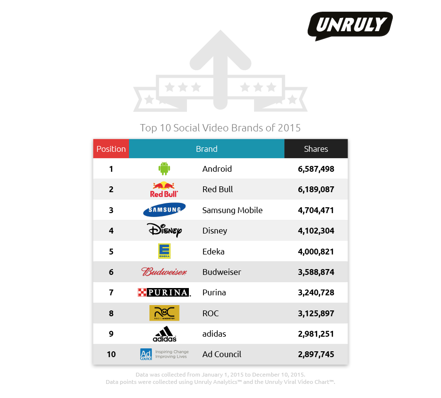 Unruly announced the top 10 most shared brands of the year today at the Video Sharing Awards (#VSAs). And the most successful social video brand of 2015, according to new data at the event, was Android.