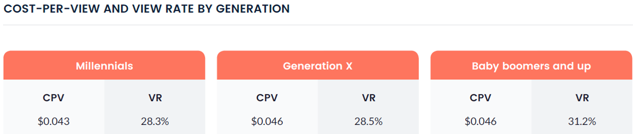 - Baby boomers will actually watch your ads – yielding a 10% higher view rate than millennials and gen Xers.