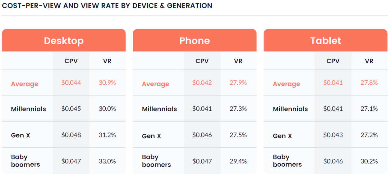 As the chart below shows, desktop computers have the highest view rate among all generations, but these devices are also the most expensive to target. Gen Xers are less likely to watch an ad on a tablet, but this is also the cheapest place to reach them. The stereotype of boomers as Luddites is debunked by their consistently higher view rates across all devices compared to both millennials and Gen Xers. It’s also important to note that boomers are more likely to watch YouTube ads on their smartphones than any other generation.