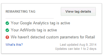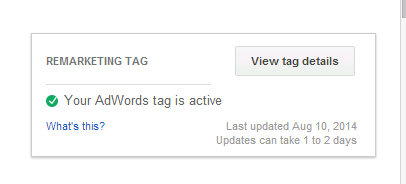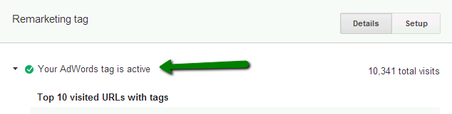 Then click on “Your Adword Tag is Active” in the details tab and you’ll be able to see a list of the top 10 URLs that are tagged with your remarketing pixel.