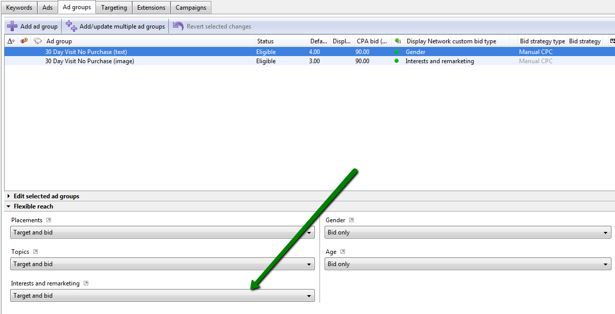 I’ve also seen several accounts where a remarketing campaign was set up, then never gets a single impression. This is typically because the “flexible reach” settings for the adgroups are set to “bid only” for interests and remarketing. You need it set to “bid and target” for the system to view your selected audience as a targeting type. This can be switched easily in Adwords Editor on the ad group tab in the “flexible reach” section.