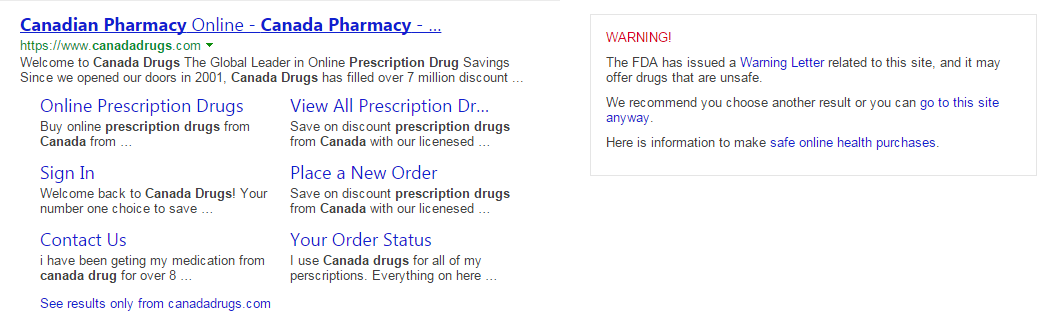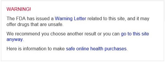 Here is what the new warning looks like when someone clicks through to an FDA cited pharmacy.