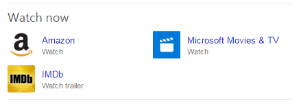 But on the Bing version, they only list 3 sources, with both Google Play and iTunes noticeably absent. Instead they include Amazon, Microsoft Movies & TV, and then an option for iMDb to view the trailer.
