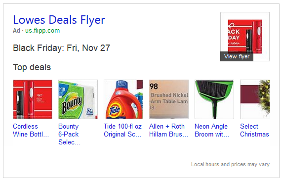The ads highlight the entire flyer with a “view flyer option” along with thumbnails and links to individual items that are on sale for Black Friday. The ad unit also includes when the Black Friday sale officially begins, either Thursday or Friday, and the opening time.