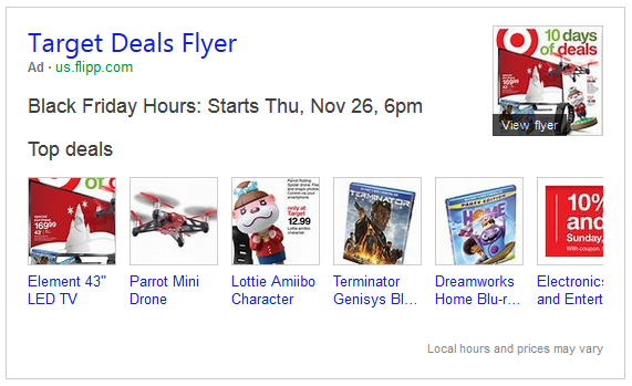 It is definitely an interesting way to present a flyer as an ad at the top of the Bing search results. We could see them start showing up for flyers outside of a huge event like Black Friday.