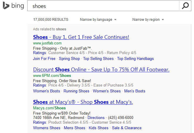 Bing Ads is testing a new expanded review ad format, officially called Consumer Ratings Annotations. Normally, with the reviews extension we see the number of reviews, how many stars the company has, and a link to the reviews on Bing. Now, there is also an additional review line added to the ad, showing further detail about specific aspects of reviews.