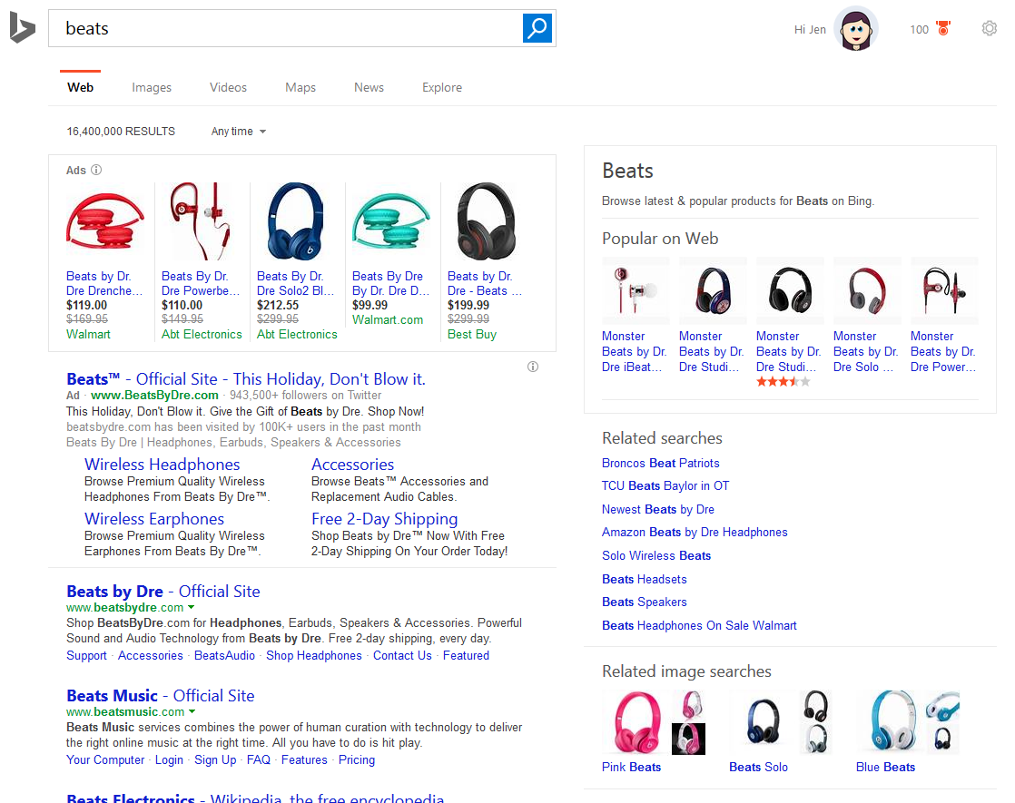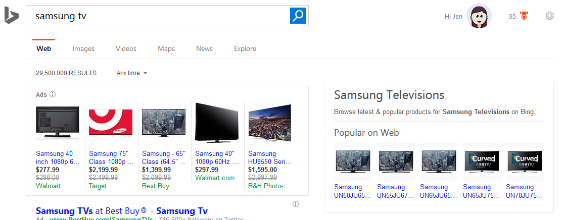 Note that these “Popular on Web” results are not sponsored results, although underneath it, you can see a shopping ad unit from Bing Ads.