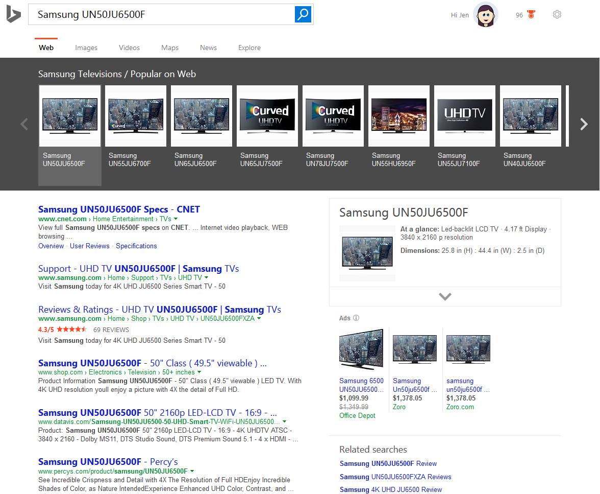If you search for a product type without specifying a specific model on Bing, they are now including a new section on the right hand sidebar of the search results highlighting specific models of the product that are popular, which then launches into a product carousel.