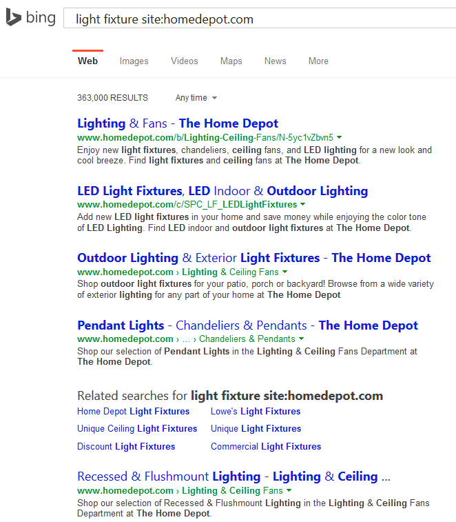 When comparing the two, Google’s site search box option is definitely the superior search option, particularly since it shows their search results with product visuals, while Bing just has in their own search results.