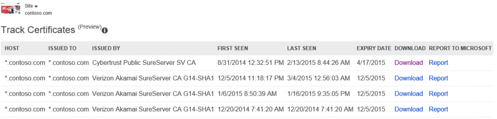 Track Certificates (Preview) — which was built in collaboration with Microsoft OSG Enterprise Security (see their post here) — allows you to track and review certificates that were requested by browsers visiting your site right from within Bing Webmaster Tools. What’s more, Track Certificate not only shows you the certificates we encountered, you can also directly report certificates to Microsoft if they look fraudulent or suspicious. All reported certificates will be reviewed and appropriate action will be taken by Microsoft, including involving the issuing Certificate Authority, or informing other browser manufacturers about the certificate.