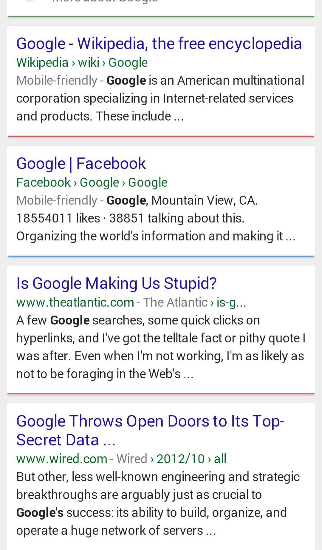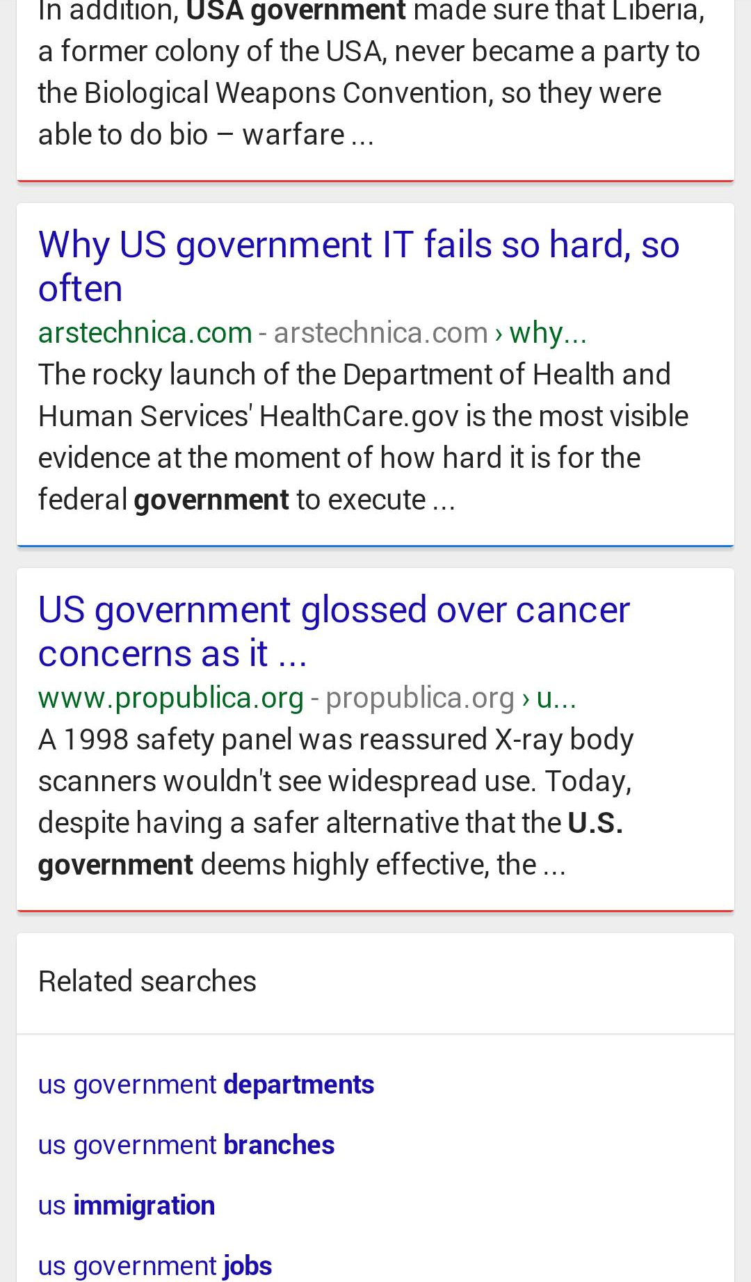 Here is another example where we see a mix, including a curious duplicated of .gov. But as you can see when there is no further breadcrumb beyond the site name, the green site name completely stands that particular result out from the rest of the sites listed.