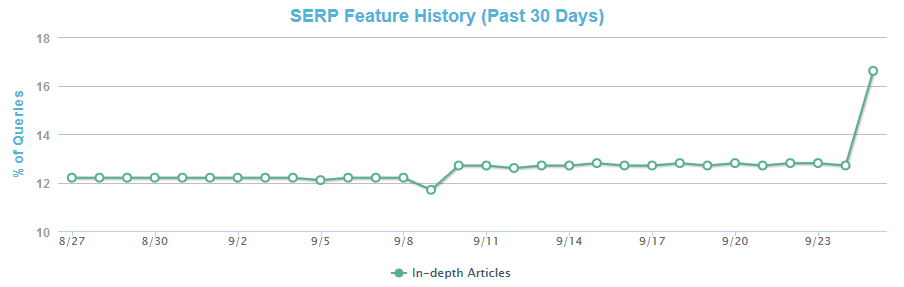 Looking at Mozcast data, there was a dip on September 9th before it increased to 12.7% the following day. However, the September 25, 2014 jump went up by 30%, with in-depth articles now being shown in 16.6% of the tracked search results.