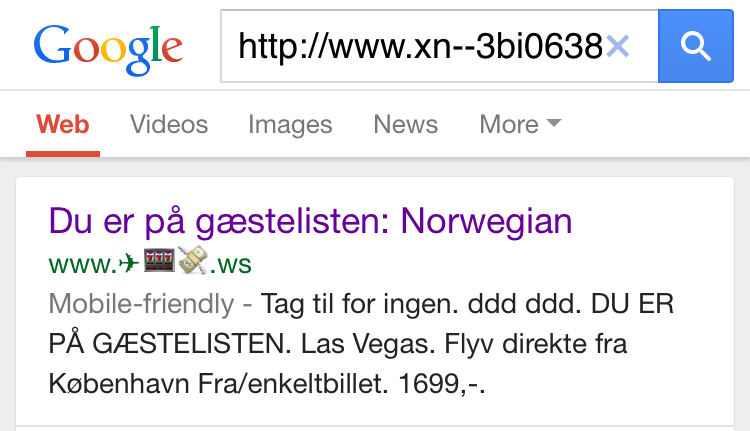 Then he took it a bit further and registered his own domain that was converted into punycode, using the code for 5 stars in a row. Then he got his five starred domain into the search results in less than half an hour.