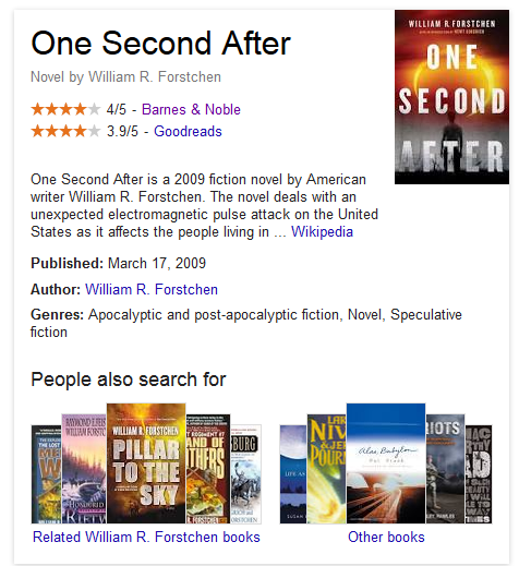 As a bonus for SEOs, if you do your own search for One Second After, and click the Goodreads link in the knowledge graph, you can find the review Matt Cutts wrote for the book.