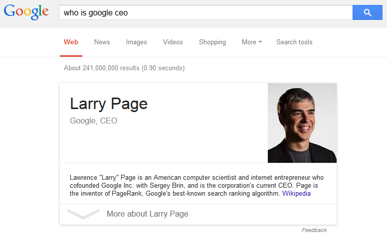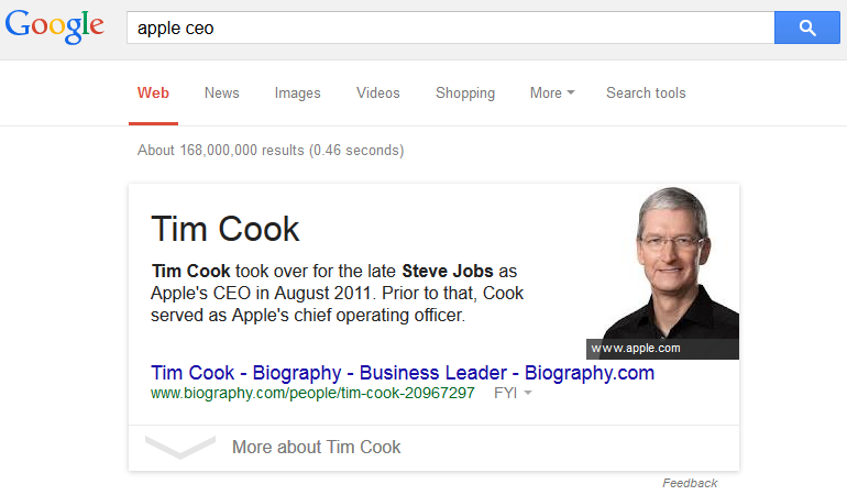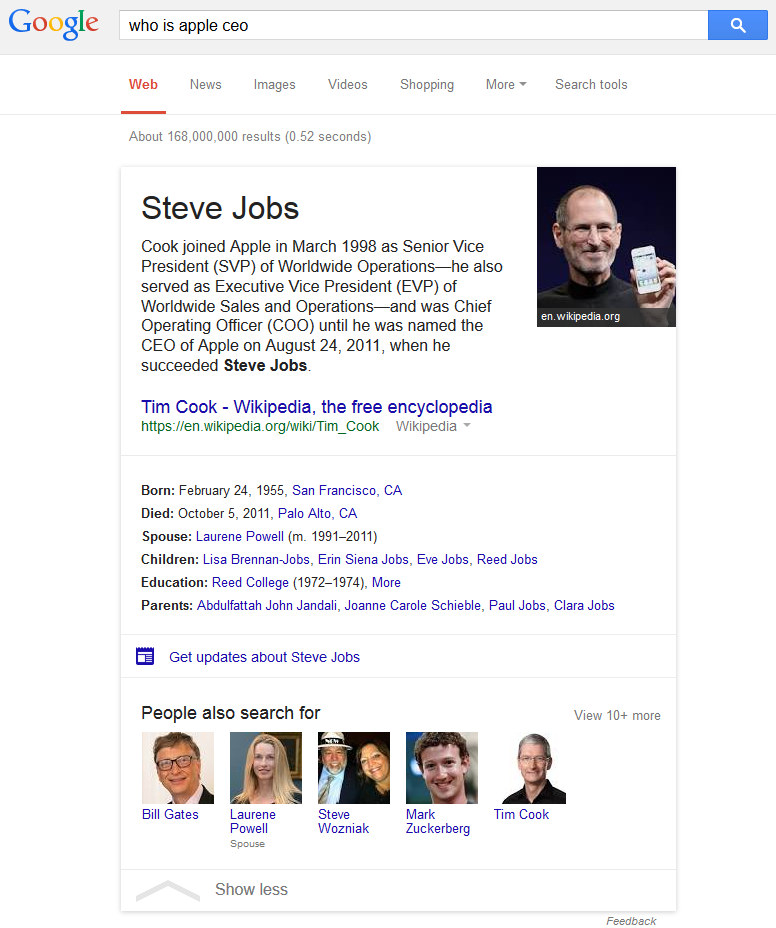 However, there are some errors happening. For example a search for Apple’s CEO lists Steve Jobs name with his photo from Wikipedia, but has the biography and source link of Tim Cook, the current CEO. When you expand the listing, it shows the detailed information for Steve Jobs, which matches the title and photo, not for Tim Cook, which is the information included in the main portion of the panel and the URL.