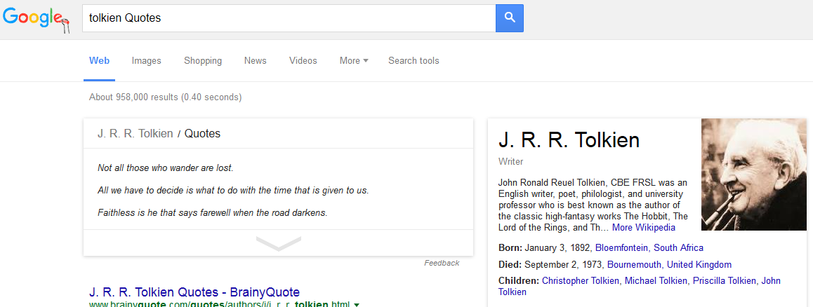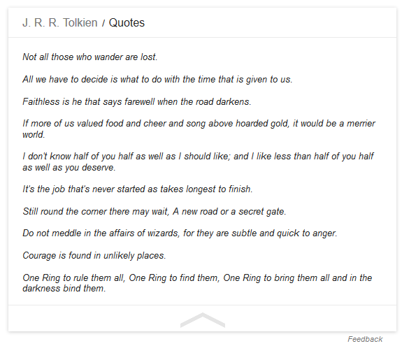 And when you click on it, you see a knowledge card which is triggered by the search for “Tolkien quotes”.