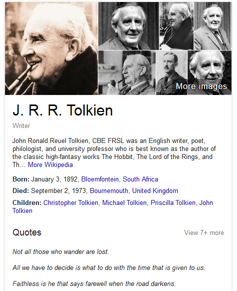 Here is an example of a search for Tolkien and the knowledge panel showing a sampling of quotes. There is also an option to show more quotes – 7 more in this case.