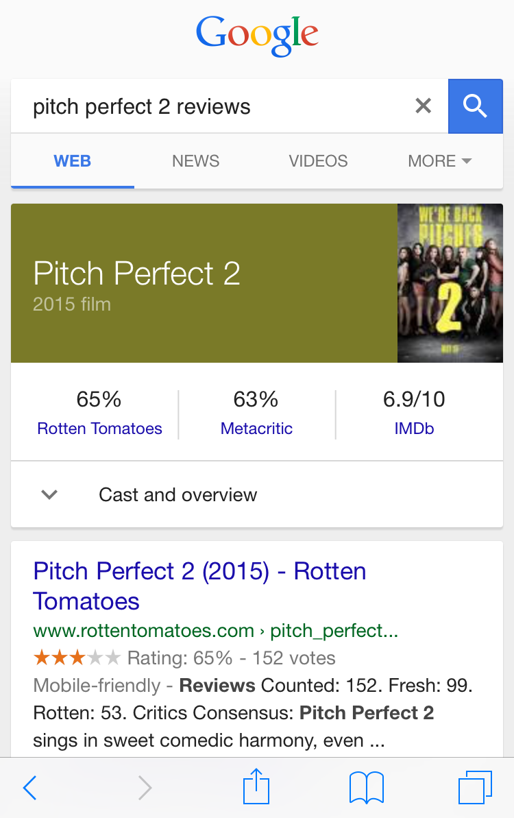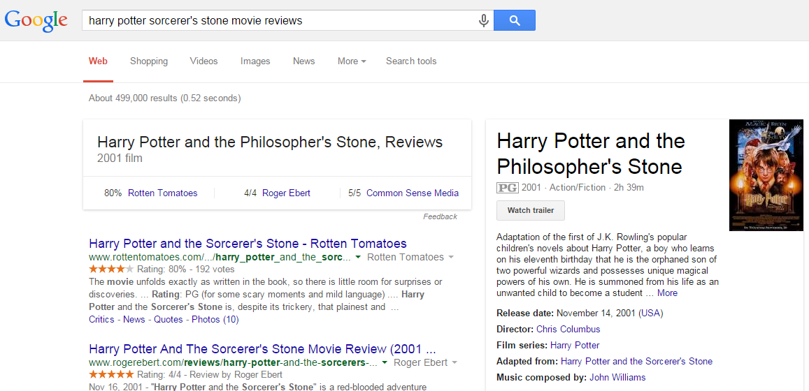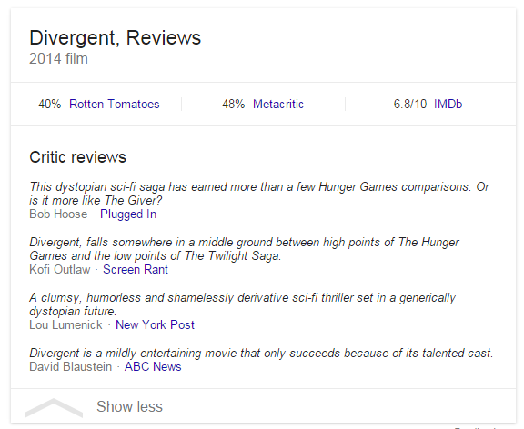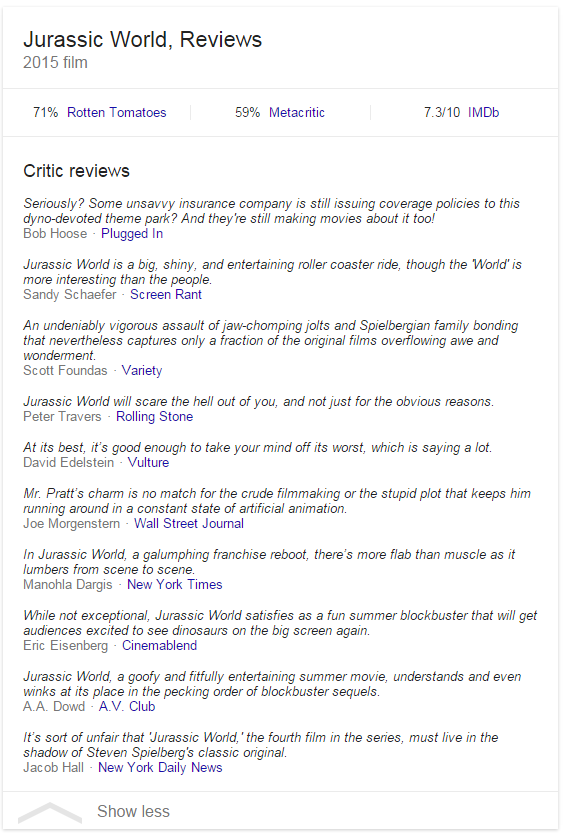 One nice feature of this is that it gives searchers a taste of what each review is. It also highlights more movie review sources, ones that might not necessarily show up in the first page of the search results, and includes sources that some might not think to look at for reviews.