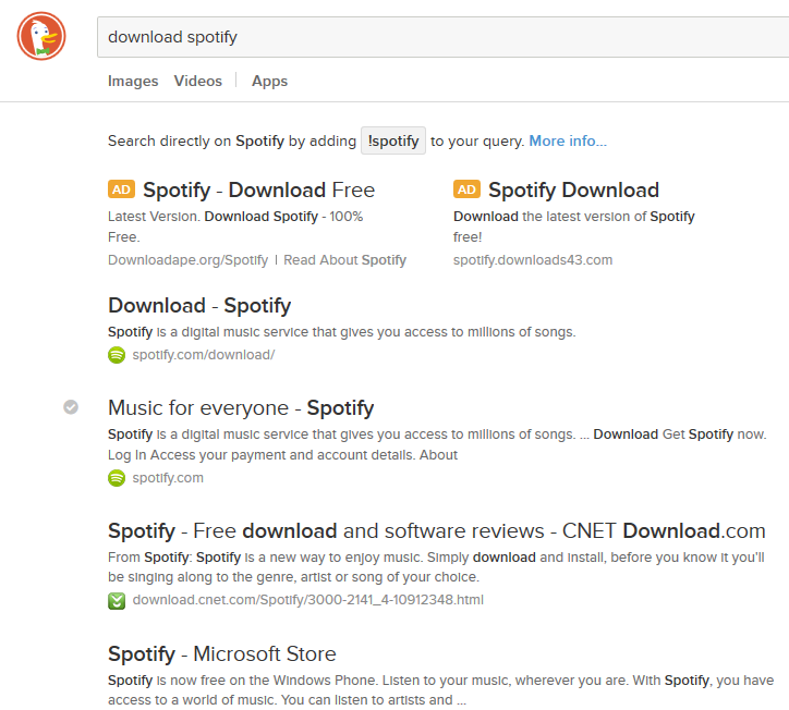 We also tried the “download spotify” search on Bing, Yahoo and DuckDuckGo to see how likely it was a user would be able to download safely from the official site. Surprisingly, Yahoo was the only one to deliver the official site as the first result, which appeared as an ad above the search results, although Spotify also claimed the top spot in organic.