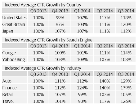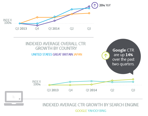 Adobe Digital Index released their Global Digital Advertising Report for Q3 2014 and found that CTR is up by 18% YoY. They also discovered that CTR growth is increasing across many countries, but with a significant 20% increase specifically in Great Britain.
