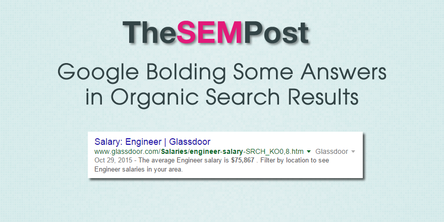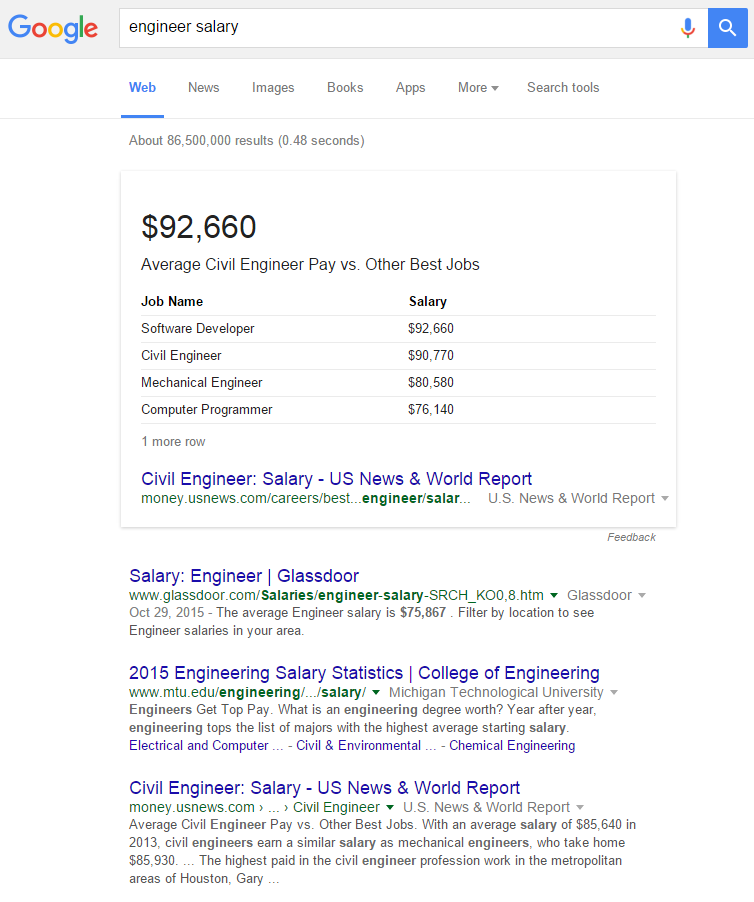 And for the “engineer salary”, there is also a featured snippet for that result, but it actually shows a different answer. And even more interesting, when you look at the search result (#3) for the site that got the featured snippet, the salary isn’t bolded in their regular search result either.