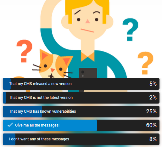 In the comments they do clarify that this is strictly for alerting users that there is possibly at issue with their CMS or template. They don’t want to be involved in doing any updates or fixing – they are just exploring whether webmasters want to be alerted to them or not.