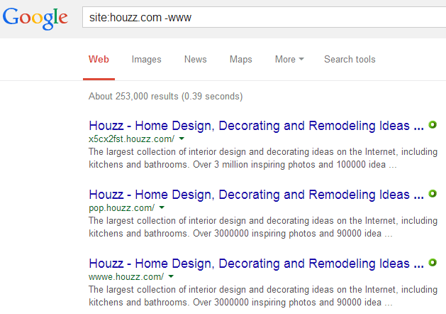 In this case a Google search of “site:houzz.com -www” revealed a herd of zombie sub-domains equating to 253,000 results of which likely a large number are composed of duplicate pages.