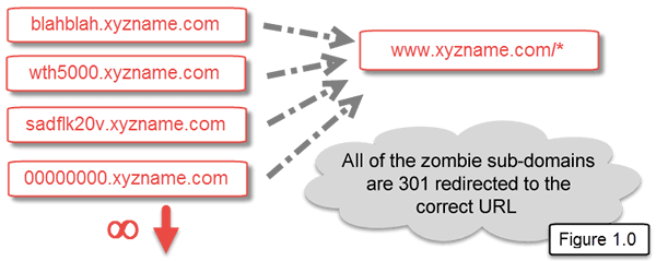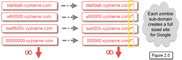 In Figure 2.0 each zombie sub-domain creates another unique path to the same content that is meant to be found ONLY on www.xyzname.com resulting in nightmarish hordes of duplicate content and wasted indexing for Google.