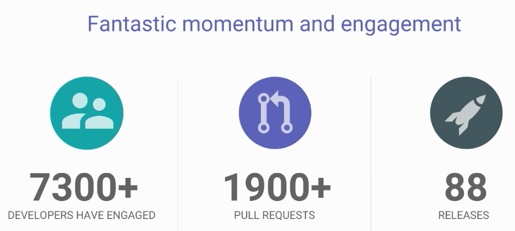He also commented about how active and supportive the developer community has been, with over 7300 developers with 1900+ code pulls and 88 releases.