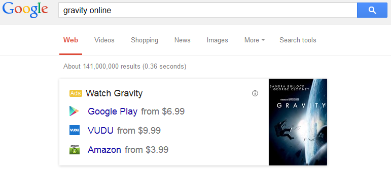 The other thing noticeable about these knowledge graphs is that they are appearing front and center at the top of the search results but also that no other ads are appearing on the page for those keywords – even for very popular titles you’d think would contain ads.