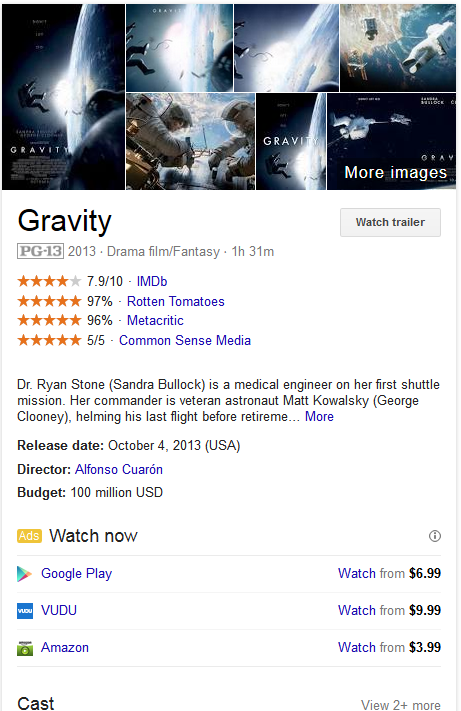 Here is what the same movie looks like with its usual right had side knowledge graph – it is much more detailed.
