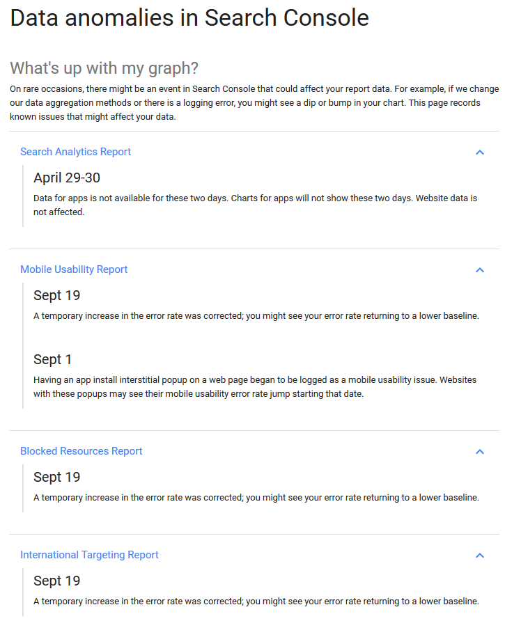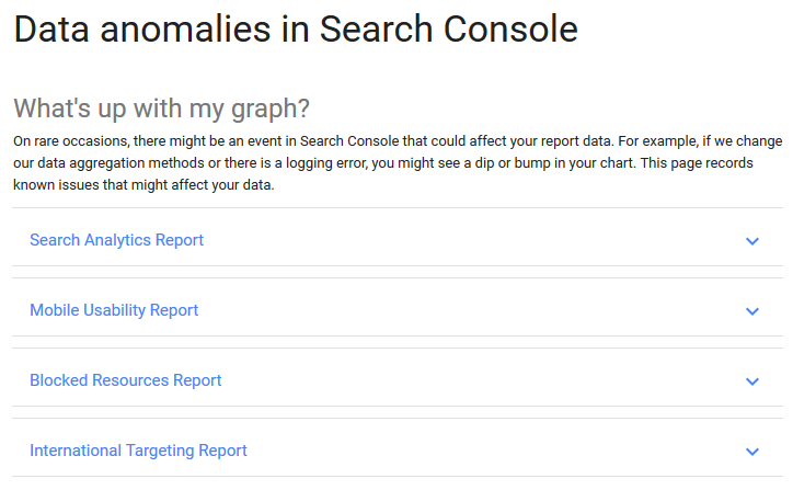 Prior to the change, the Data Anomalies page just listed “Search Analytics Report” but now it includes three additional sections. The added ones are “Mobile Usability Report”, “Blocked Resources Report” and “International Targeting Report.”