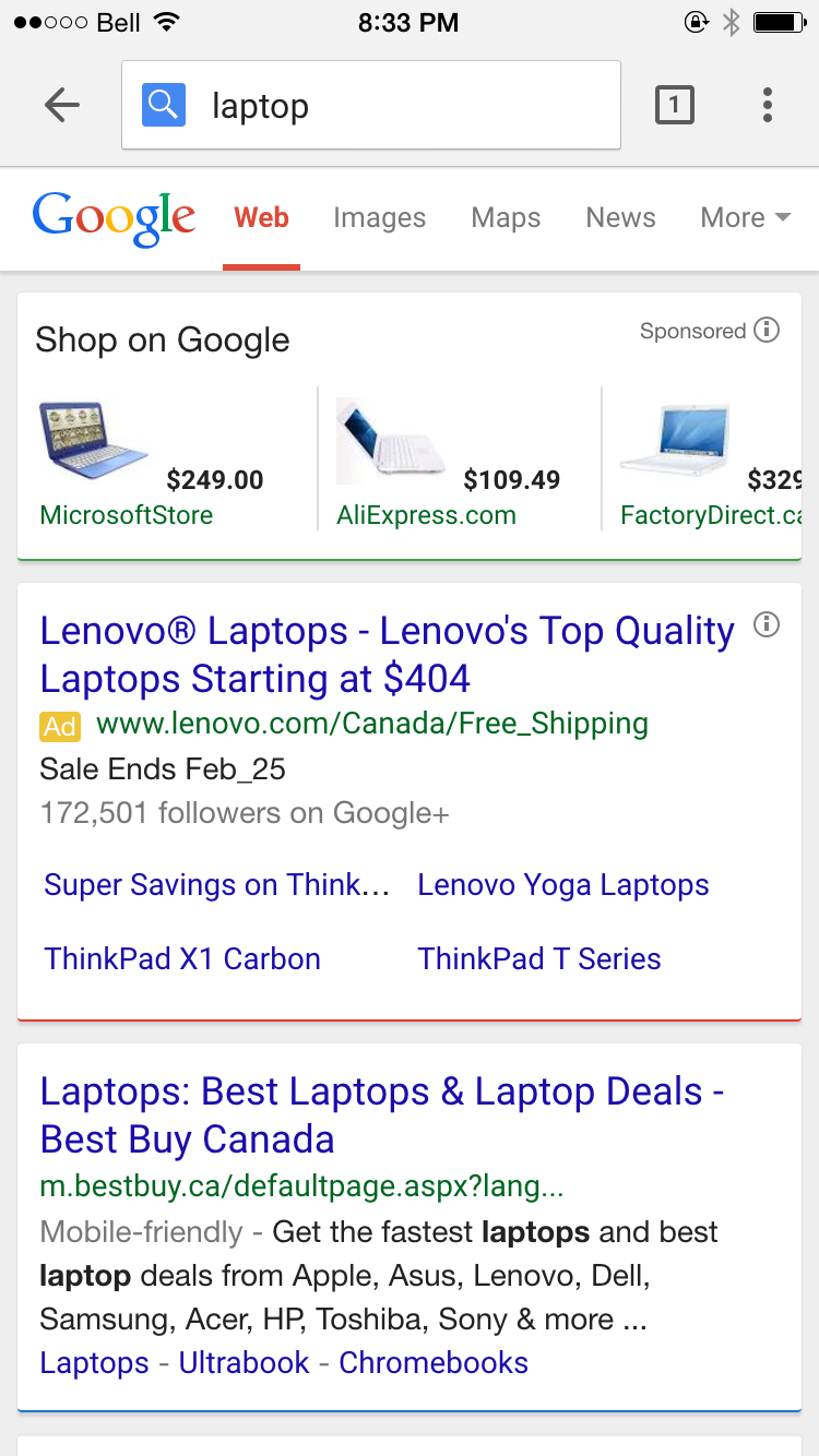Google AdWords ads and Google Shopping Ads also receive the colored line treatment, and it really does make them stand out.