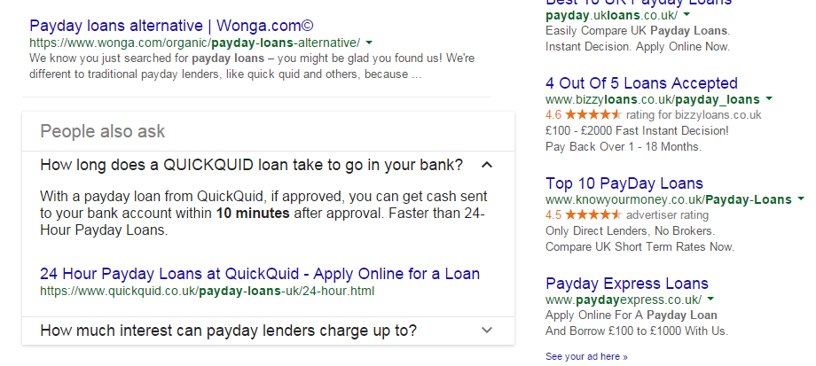 In this case, a search for “payday loans”, a high value keyword phrase – and one that sees quite a bit of spam – is displaying a “People also ask” box in the Google search results.