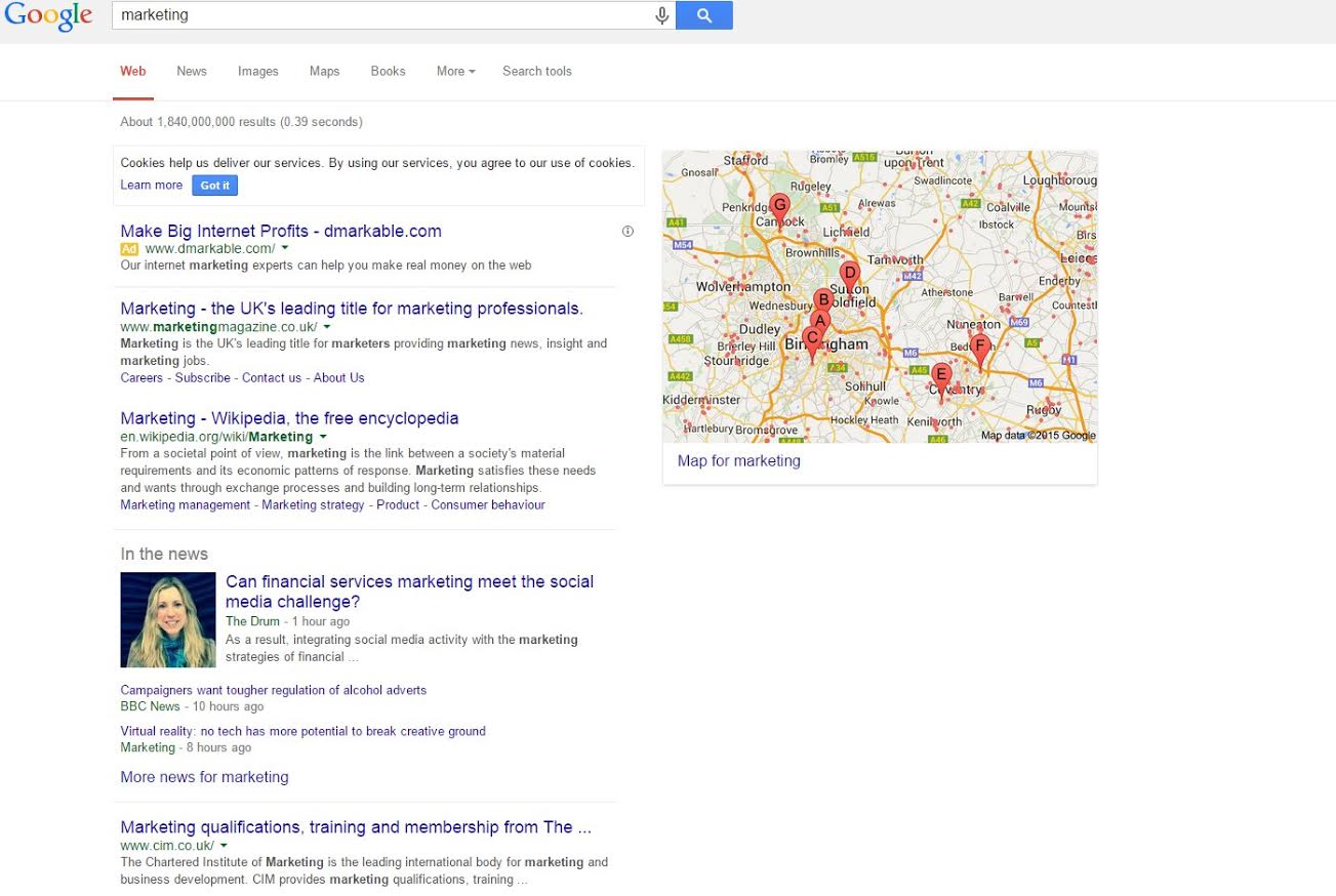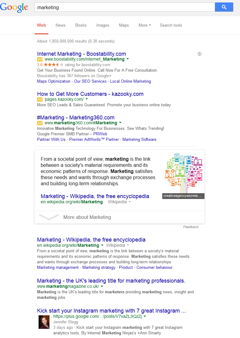 For a non-commercial search term, the term “marketing” shows a magazine in the top spot, while in the Google.com results, Wikipedia still holds the top spot in both the knowledge graph above the organic results and the top spot as well.