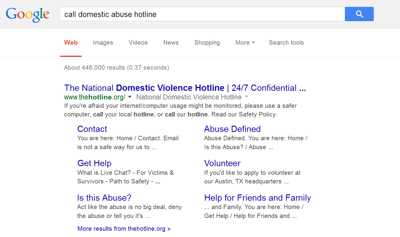Similarly, here’s the SERP for the query “domestic violence hotline”. This result also lacks an answer box with a number to call. Even when adding the action item “call”, still no answer box displays.