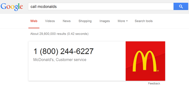 If that’s not bad enough, let’s look at a couple of more examples. Here’s the query “call mcdonalds” and how it’s displayed in the SERP.