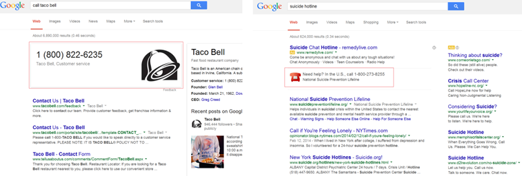 Something else that I find unsettling about this is that the answer boxes and text for the fast food customer service examples are significantly larger than that of the suicide hotline result. Here’s how the two results are displayed side by side.