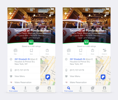 For check-ins, users will now have to download and install a separate app from the company called Swarm, which will merge check-in functionality with FourSquare. Without the Swarm app, checking-in at a location will not be an option, instead it only displays relevant local information such as info, ratings and the ability to see the menu or making a reservation for restaurants.
