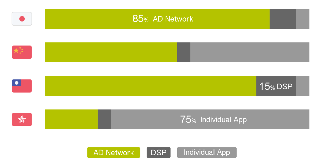 Ad network has majority of market share in Taiwan and Japan. DSP is more popular in Taiwan than other markets. The market share of individual app takes up 75% of Hong Kong mobile advertising market, and 45% of mobile advertising market share in China.