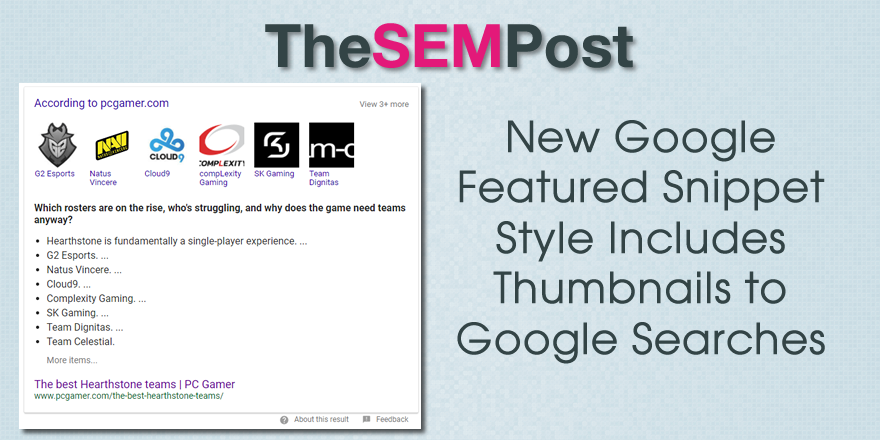 The thumbnails and names are six across, with the option to click the “View 3+ more.” This then triggers the carousel which does not actually show when someone searches for “Hearthstone teams” but it also removes the featured snippet when doing so.