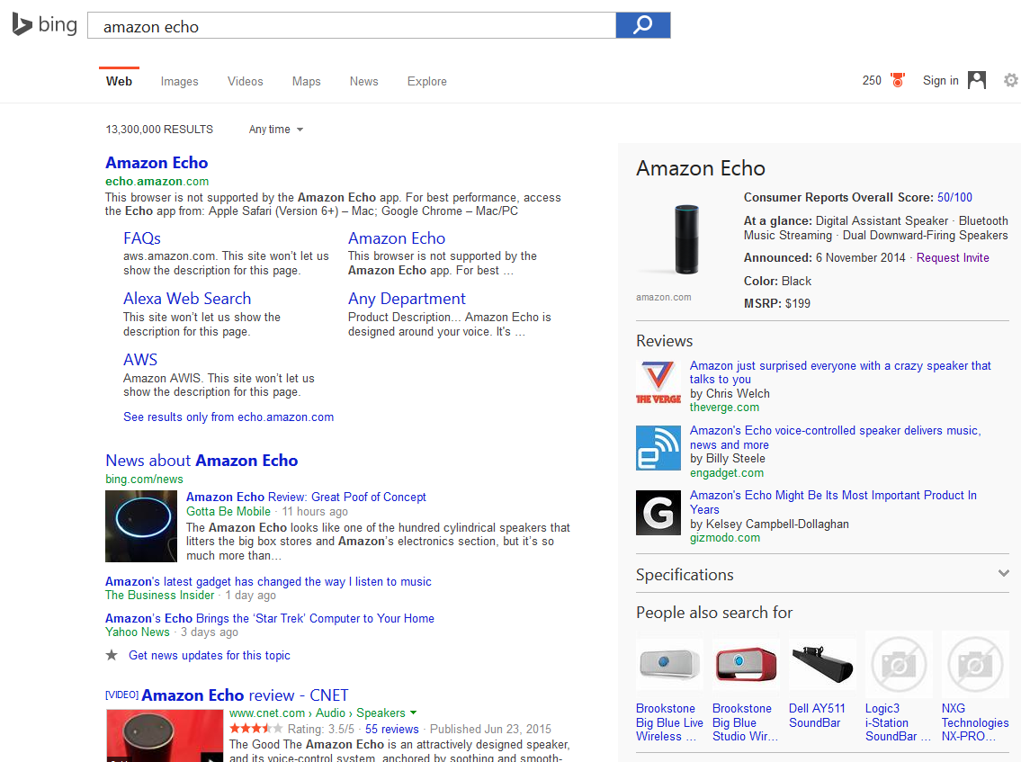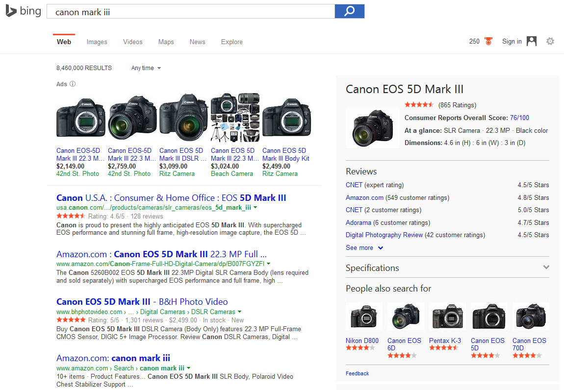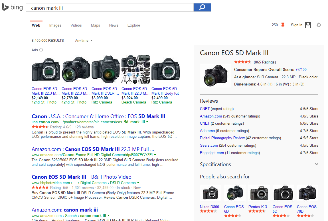 It is worth noting that some of the review sites are very industry specific to the product. For example, Digital Photography Review is an option that would really only be shown for photography related results, so it shows that Bing is look for not just multi-industry sites for reviews – such as Amazon – but also smaller niche review sites.