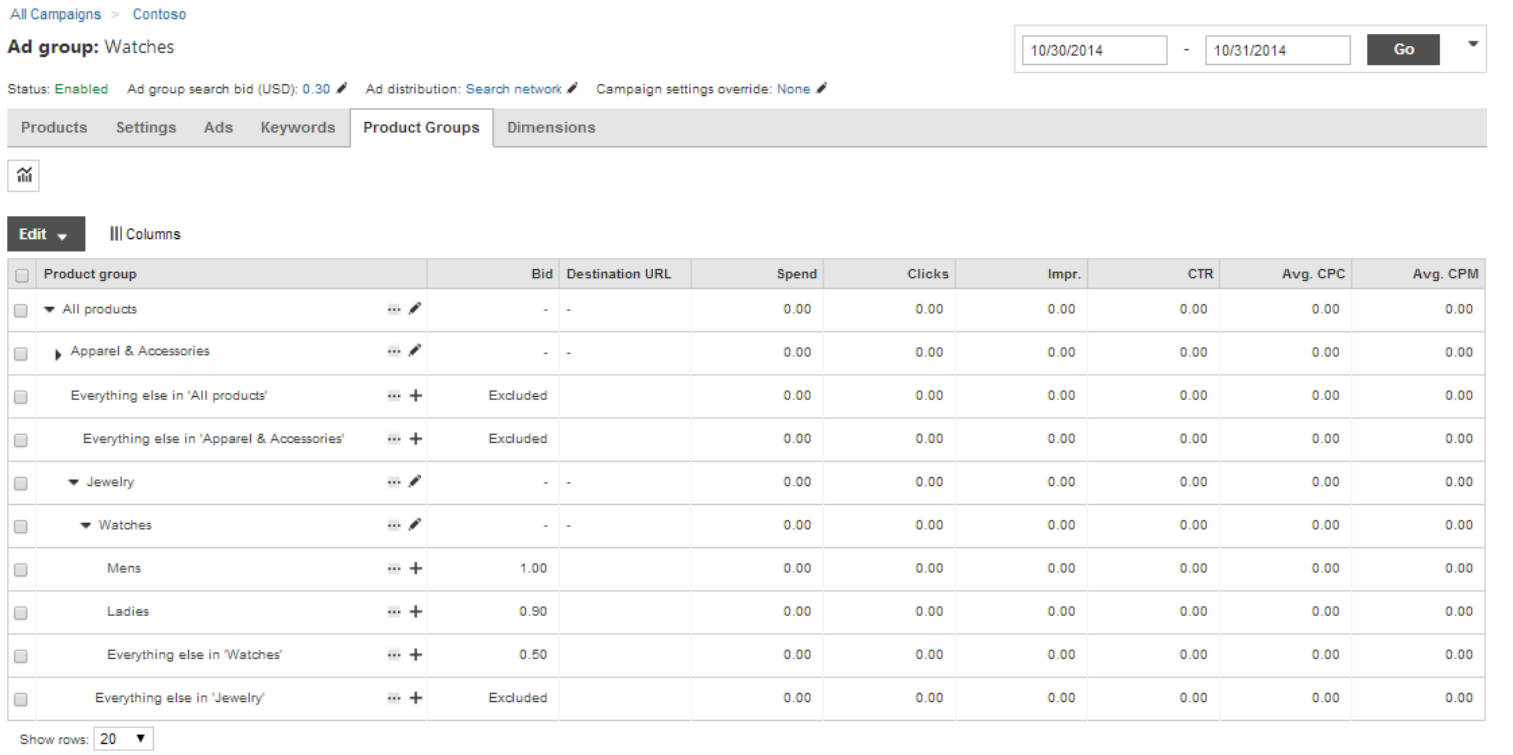 In general, you should set up at least two shopping campaigns: one (or more) high priority, higher bid and higher budget campaign targeting specific product segments and one low priority, lower bid and lower budget campaign targeting all products in the feed. Recall that you may segment products according to your objectives, using attributes such as product category, product type or custom label. For instance, if you wanted to further segment the Bing level 4 product category of “dress pants” into wool, tweed, linen and cotton dress pants, you could use a custom label to do so.
