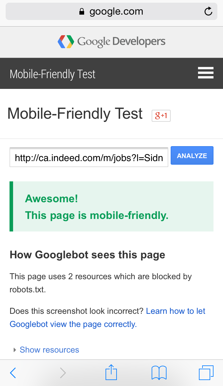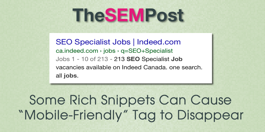 “hi grant! thanks for the example. turns out our engineer is aware of this issue — currently the mobile-friendly badge can be trumped by a few other UI cases: pagination, “jump to” app links, and video thumbnails… fyi we may change the display and have the mobile-friendly badge override the other conditions. he’s going to look into it further.”