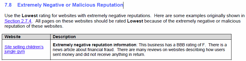 Important: Negative reputation is sufficient reason to give a page a Low quality rating. Evidence of truly malicious or fraudulent behavior warrants the Lowest rating.