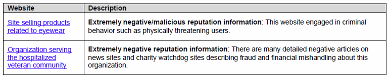 When looking at negative reputation in malicious or fraudulent areas, it includes things such as financial fraud reports, overwhelmingly negative reviews, negative reviews from watchdog sites and negative news reports.