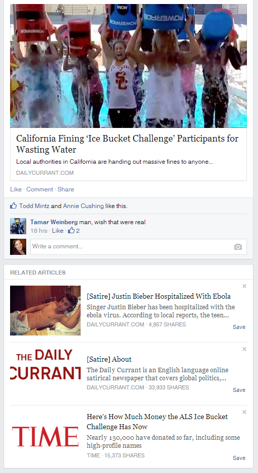 Related articles pop up after someone clicks on a headline for another related story in their news feed. Because these headlines are almost always news related, people are believing the stories are true, without noticing they link to a satire news site such as The Onion or Daily Currant.