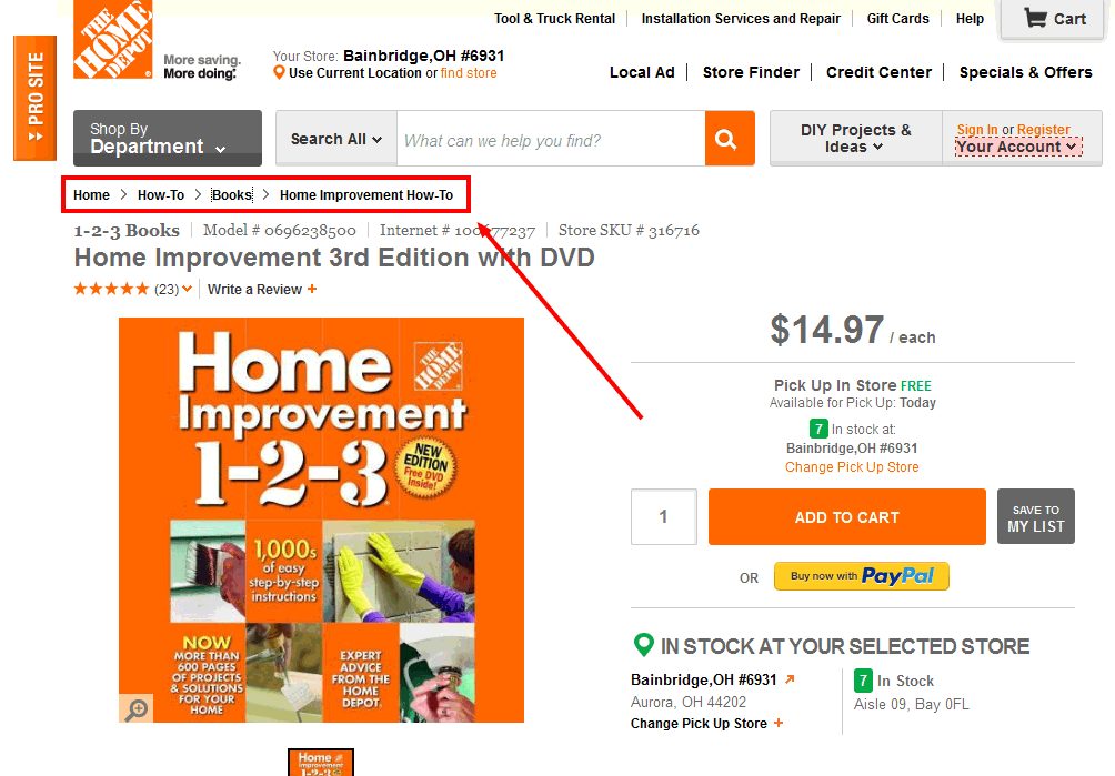 Going back to my made-up Home Depot URL above, notice how it coincidentally coincides with the on-page breadcrumb trail: