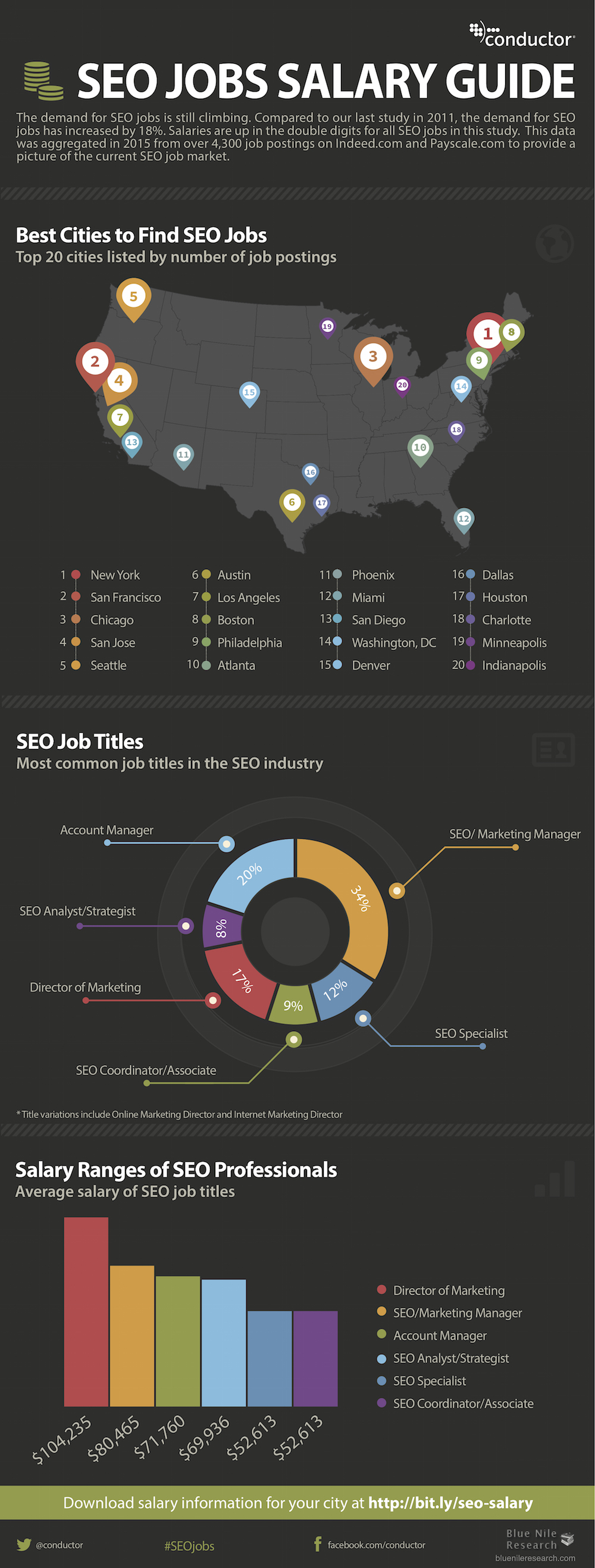 SEO professionals are in high demand in 2015. Even better news – salaries also continue to grow. Both those findings come courtesy of Conductor, which crunched some data from 4,300 active SEO industry U.S. job postings on Indeed.com and Payscale.com.
