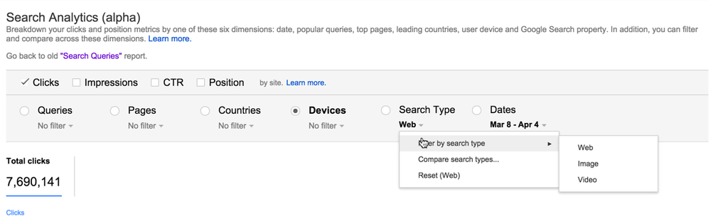 In addition to the URL filtering added today, Annie Cushing from Annielytics has noticed that Google Webmaster Tools has revamped their search types and devices in the new Search Analytics Alpha/Beta. What does this mean? No more endlessly clicking back and forth between web and mobile like you currently have to do in the regular Search Queries reporting.